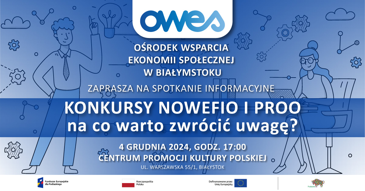 Zapraszamy przedstawicieli organizacji pozarządowych do udziału w spotkaniu informacyjnym, organizowanym przez Ośrodek Wsparcia Ekonomii Społecznej w Białymstoku, które odbędzie się 4 grudnia br. o godz. 17.00 w Centrum Promocji Kultury Polskiej w Białymstoku, ul. Warszawska 55/1